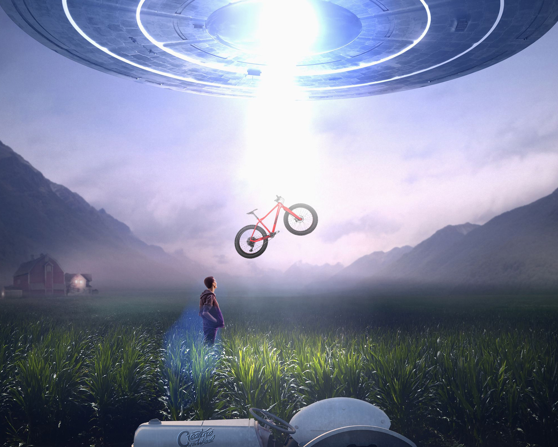 Another composite image created for the Creature of the Wheel lifestyle brand. Sometimes I create images like this to inject some element of humor and playfulness to the brand. This particular composite is called "CREATURE TOOK MY WHEELS". The irony is that the UFO ends up abducting the bike instead of the human being because aliens are just as passionate about wheels as their human counterparts!