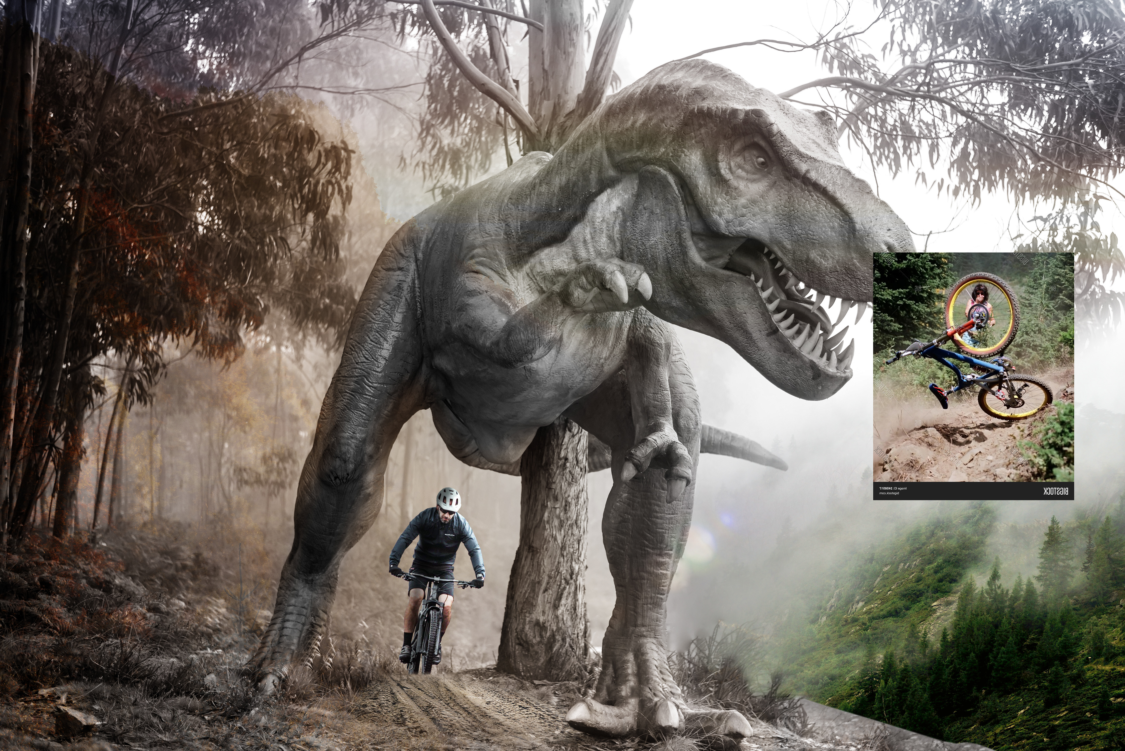 The images below show how the image was built from the main image of the dinosaur in the woods.