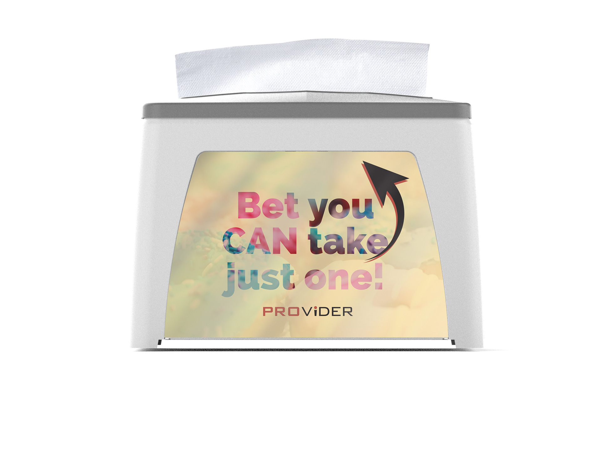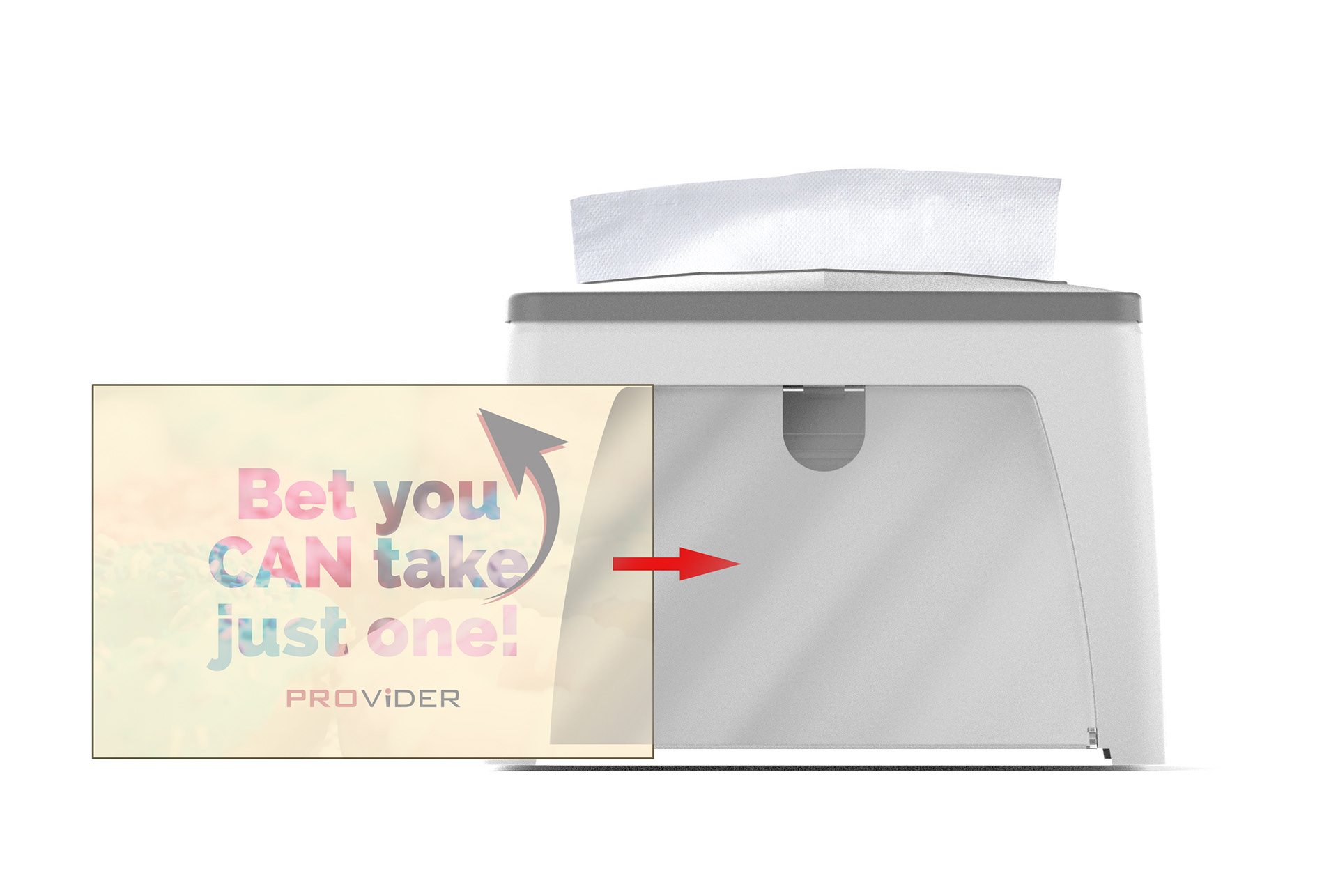 The copy and concept of this particular insert design lets users/patrons know that the dispenser is designed to only dispense one napkin at a time, therefore reducing waste.
